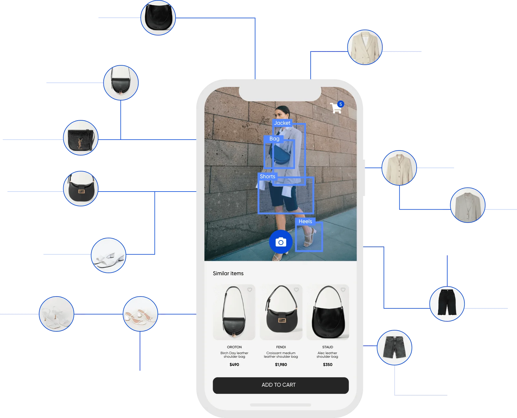 Visual AI 엔진을 통해 이미지 속 패션 상품을 자동으로 식별하고 유사한 상품을 추천할 수 있게 개선했어요. 한 장의 이미지에서 의류는 물론 신발, 가방, 귀금속, 액세서리까지 자동으로 분류할 수 있었습니다.