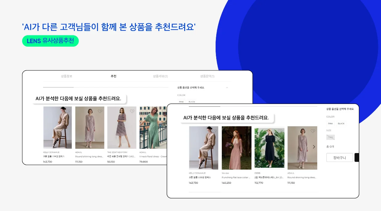 마지막으로 고객 경험 향상을 위해 상품 추천에 힘썼습니다. 상품 상세페이지에 별도 추천 탭을 두어 <이 상품들은 어때요?>, <AI가 다른 고객님들이 함께 본 상품을 추천드려요.>, <AI가 분석한 다음에 보실 상품을 추천드려요.> 등 업셀링 & 크로스셀링 관점에서 고객이 다양한 상품을 추천 받을 수 있게끔 구성했어요. 더불어 디테일한 상품 태그값을 활용해 트렌드 키워드를 보여주고, 기획전에 사용하는 등 여러가지 추천 솔루션들이 사이트 내에서 다양하게 믹스되어 출력되고 있습니다. 이 과정에서 옴니어스 솔루션을 사용했죠.