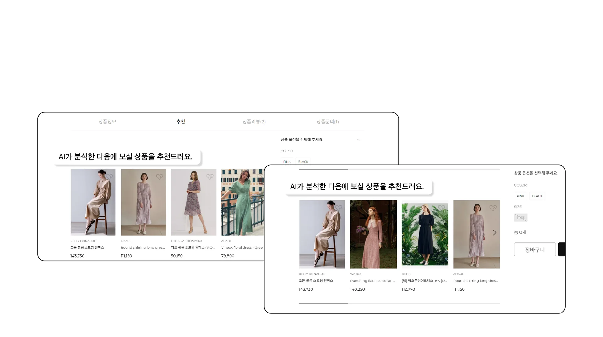 - 유사상품추천으로 확대된 자사몰에서도 원하는 상품을 쉽게 구매할 수 있도록 구성했어요.