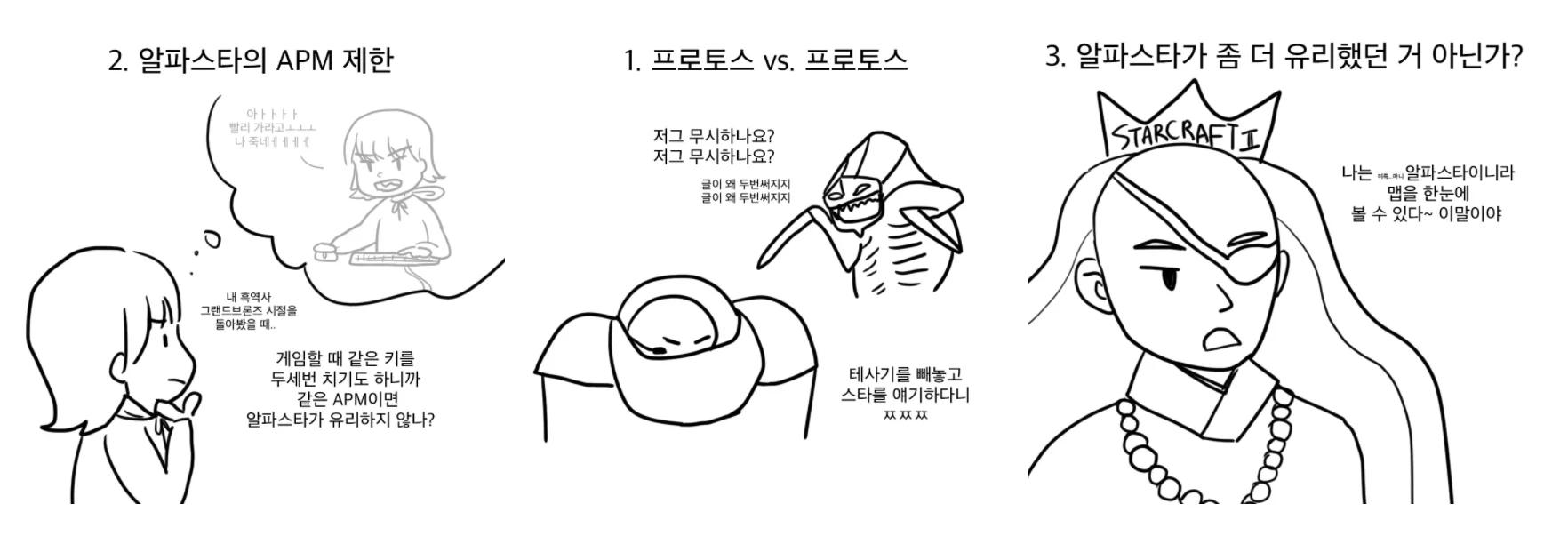 2) 알파스타의 APM 제한 : 아무래도 AI가 인간보다 컨트롤이 빠르겠죠? 이번 경기에서 알파스타의 APM(Actions Per Minute, 1분당 내리는 명령의 수)은 평균 277 정도였고 TLO, MaNa는 각각 678과 390 수준이었습니다. 알파스타가 손이 빨라서 이긴 건 아니라는 말이지만, 이런 단순 APM 비교는 의미가 없다는 의견도 있습니다. 사람은 게임을 할 때 같은 키를 여러 번 누르곤 하잖아요. 알파스타에겐 이런 무의미한 키 누름이 없을 거니까 단순 APM 제한은 의미가 없을 테고 인간이 피지컬에서 불리하다는 거죠.