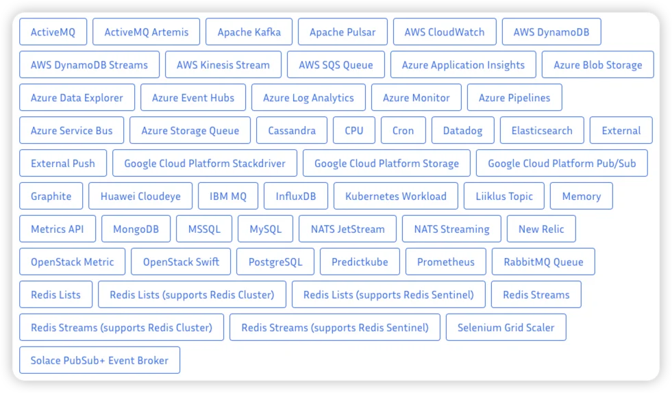 KEDA는 아래 그림과 같이 수많은 Scaler를 지원하고 있으며 계속 업데이트 되고 있습니다.