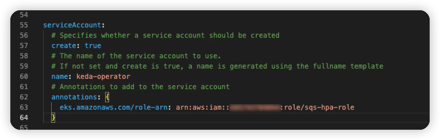 keda-operator의 적용되는 ServiceAccount의 annotation에 role-arnd을 추가해줘야하는데요
