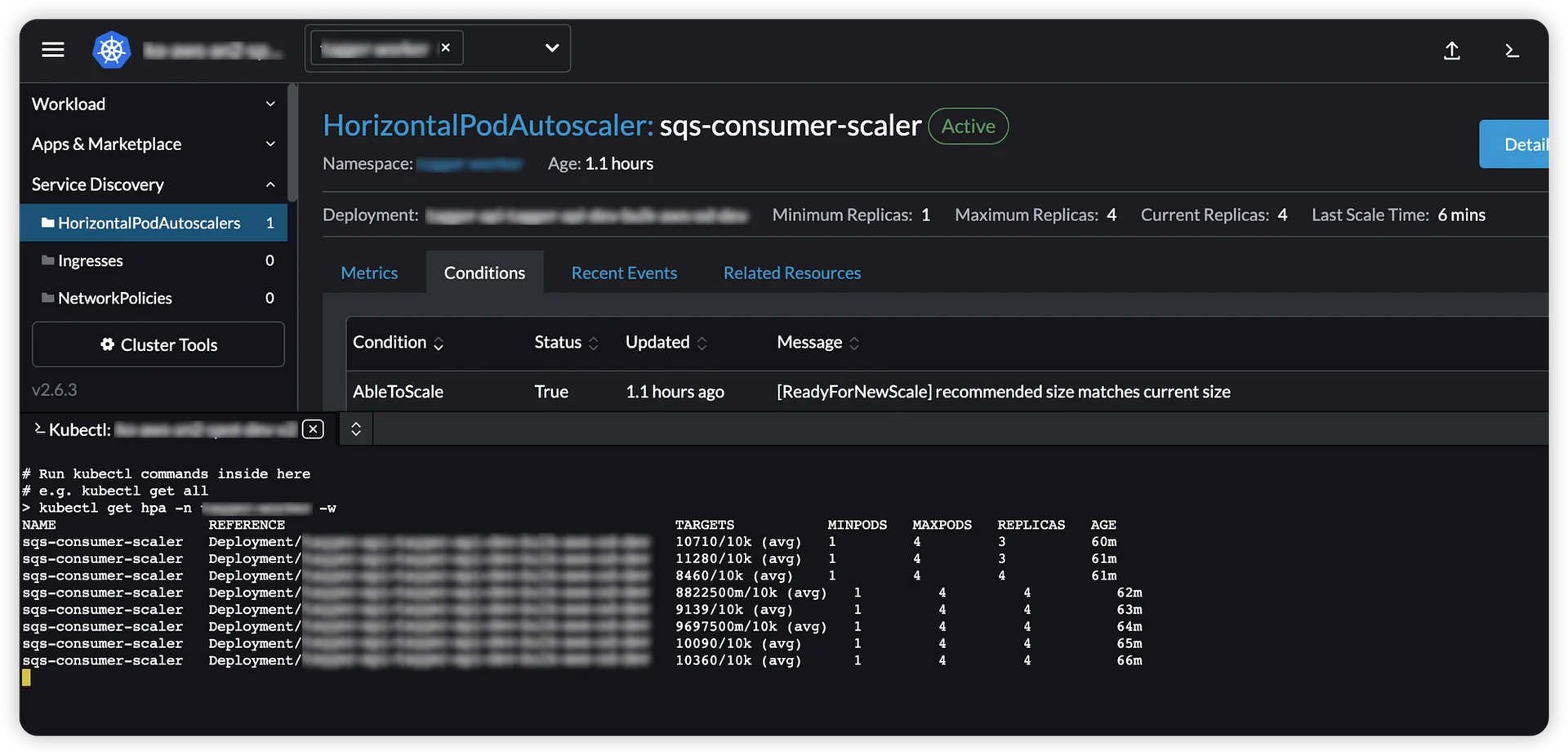 targetAverageValue가 10k에 도달하거나 그 이상으로 상승했을 때 아래와 같이 hpa를 자동으로생성하고 스케일을 시작합니다.