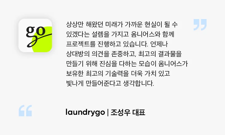 런드리고(Laundrygo)는 비대면 세탁 서비스로 27만명 이상이 이용중이다. 월 평규 약 9만건의 세탁물을 처리하면서 빠르고 정확한 시스템으로 고도화하기 위해 여러 방안을 수립중이다. 그 중에서도 세탁물 분류 자동화를 위해 옴니어스 AI를 도입할 예정이다.