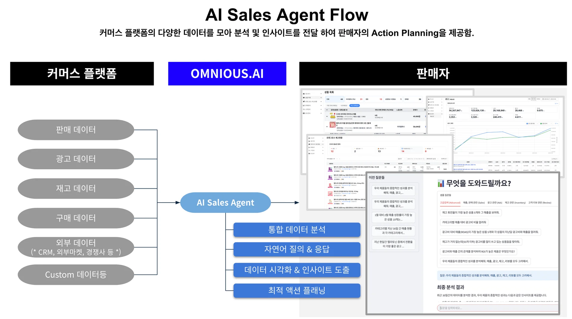 ์ด๋์ด์ค์ AI Sales Agent๋ ์ปค๋จธ์ค ์ ๋ฐ์ ๋ฐ์ดํฐ๋ฅผ ํตํฉํ์ฌ, ํ๋งค ์ธ์ฌ์ดํธ ๋์ถ๋ถํฐ ์คํ ์ ๋ต ์ ์๊น์ง ์ง์ํ๋ ๋ฉํฐ์์ด์ ํธ ๊ธฐ๋ฐ ์๋ฃจ์ ์ ๋๋ค.