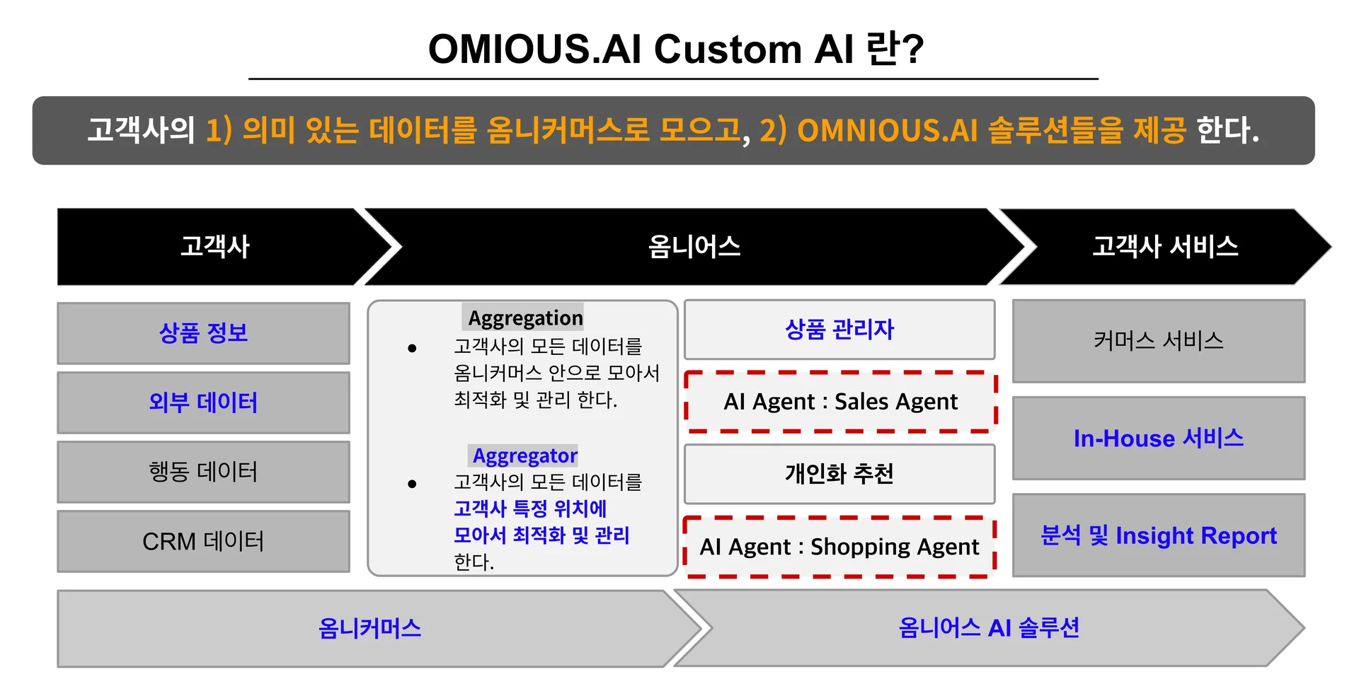 이러한 구조화된 데이터 위에 OMNIOUS는 AI Sales Agent, AI Shopping Agent, AI 기반 개인화 추천, 그리고 AI Marketing Agent 등 실질적인 커머스 성과를 낼 수 있는 AI 모듈들을 제공합니다.