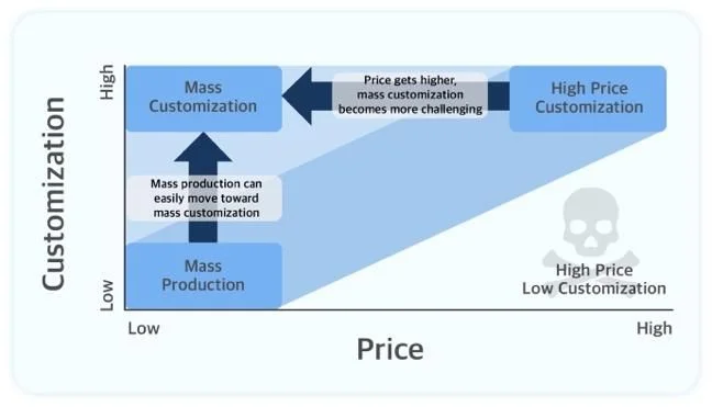 대량 개인화는 많은 소비자에게 개개인의 취향과 니즈에 맞는 상품을 제공하는 방식이다. 대량으로 생산해 생산 단가는 낮추면서 소비자들에게는 개인화의 특별한 경험을 줄 수 있다는 것이 대량개인화의 특징이다. 현재 많은 제조 산업이 대량 생산에서 대량 개인화를 실현하고 있고, 최근에는 AI 기술을 적용해 자동차 같은 상품에도 적용되고 있다. 제조 공정의 세분화, 브랜드 정체성 구축 및 일관성 유지, 그리고 시장과 소비자에 대한 이해도 등 다양한 데이터가 필수다.