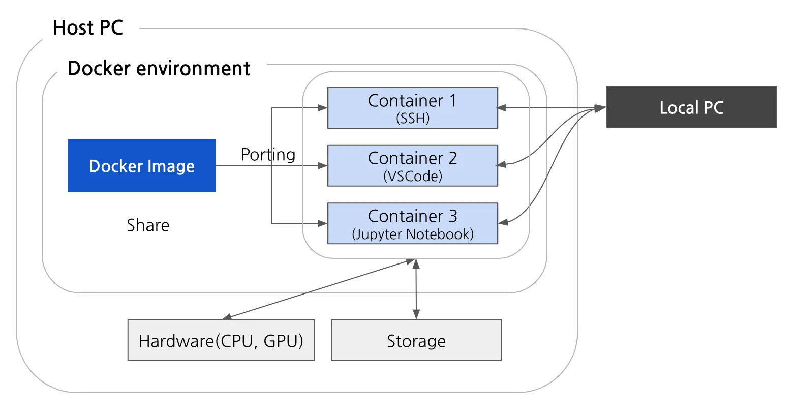 기본적인 Docker 환경 구조는 생각보다 간단합니다. 먼저 Host가 되는 PC에서 Docker를 설치하고, 운영체제 및 작업 환경에 필요한 패키지를 포함하여 이미지를 만듭니다. 이미지를 실행시키는 컨테이너는 Host PC의 CPU 및 GPU를 공유하게 되며, 저장 공간 또한 공유하게 됩니다. 그 후 이미지에 설치된 ssh를 컨테이너에 담아 띄워두면, local PC에서 ssh를 통해 Docker 환경으로 접속이 가능하게 됩니다.