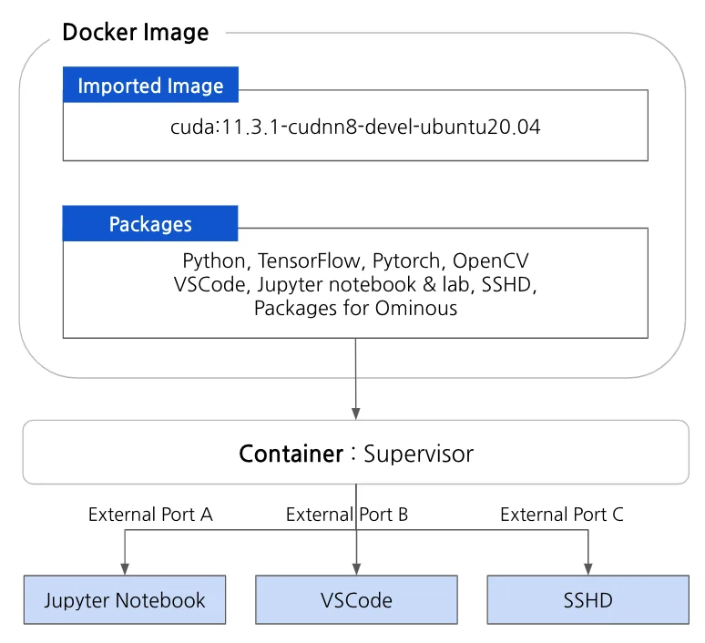 옴니어스 연구팀에서는 기본적으로 nvidia에서 제공하는, nvidia/cuda:11.3.1-cudnn8-devel-ubuntu20.0를 바탕으로, 그 위에 환경에 필요한 여러 가지 패키지들을 설치하여 패키징하고 있습니다. 이미지 내에 설치된 파일들은 컨테이너를 통해 실행시킬 수 있는데, 기본적으로 컨테이너 하나당 하나의 프로세스만을 담당합니다. 옴니어스 연구팀에서는 좀 더 효율적인 컨테이너 관리를 위해, supervisor라는 패키지를 활용합니다.