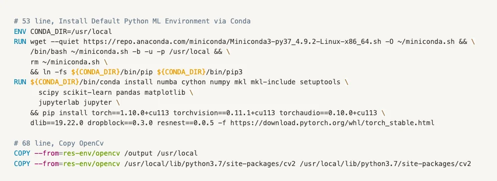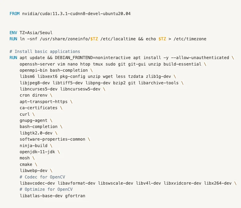 위의 샘플 코드가 연구 환경 구축을 위해 Docker를 활용하는, 가장 중요한 이유가 되는 부분입니다. python 및 pytorch와 같은 프레임워크의 버전을 CUDA 버전에 맞게 세팅해두고, 이에 맞는 여러 가지 패키지들을 설치해줍니다. 이미지 단위로 버전을 관리한다면, 일괄적으로 여러 대의 서버에 같은 환경의 업데이트를 손 쉽게 할 수 있습니다. 추가적으로, ml-docker-example에는 Dockerfile.opencv라는 opencv의 설치만을 위한 Dockerfile이 있습니다. 해당 이미지를 먼저 빌드 한 후, Dockerfile에서 COPY 명령어를 이용해 빌드 해 둔 이미지에 설치된 파일을 옮겨올 수 있습니다.