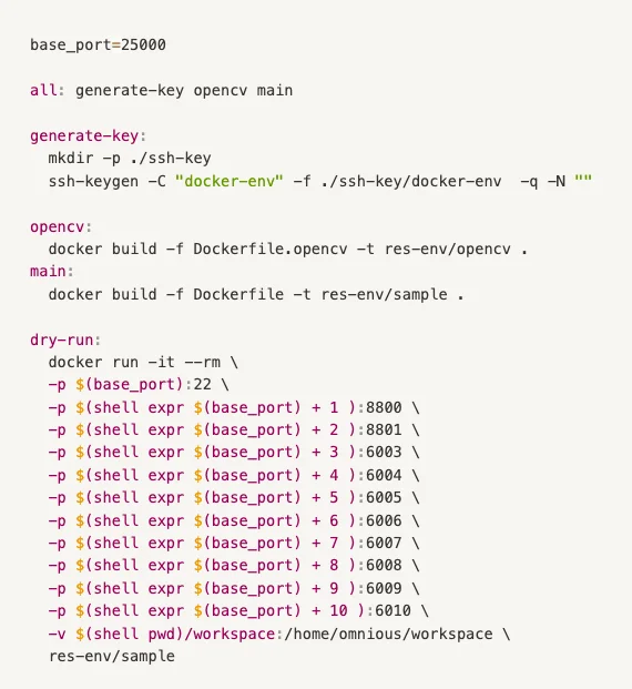 ml-docker-example의 makefile은 ssh key를 생성하고, 이미지를 빌드할 때 생성해 둔 public키를 authorized_keys로써 복사하여 옮겨오는 것을 포함하고 있습니다(Dockerfile 122 line 참조). 따라서, make all로 이미지 빌드 후 make dry-run으로 컨테이너를 띄운 다음, ssh -i private_key_location -p 25000 omnious@host_server_ip_address