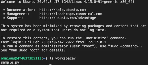 로 ssh 접근이 가능합니다. private key만 가지고 있다면, 어떤 local PC에서도 Docker 컨테이너로 접속할 수 있게 됩니다. 앞선 jupyer notebook, jupyter lab과 마찬가지로, 예제에서는 dry-run을 실행할 때, ssh를 담당하는 22번 컨테이너 내부포트를 Host의 25000번 외부포트로 지정해주었기 때문에 위와 같이 접속하였습니다. 또한 dry-run에서는 -v 옵션을 통해 workspace 내부의 sample.py를 컨테이너에 마운트 해주었는데, ssh로 접근하여 해당 파일이 존재하는지 확인해볼 수 있습니다.