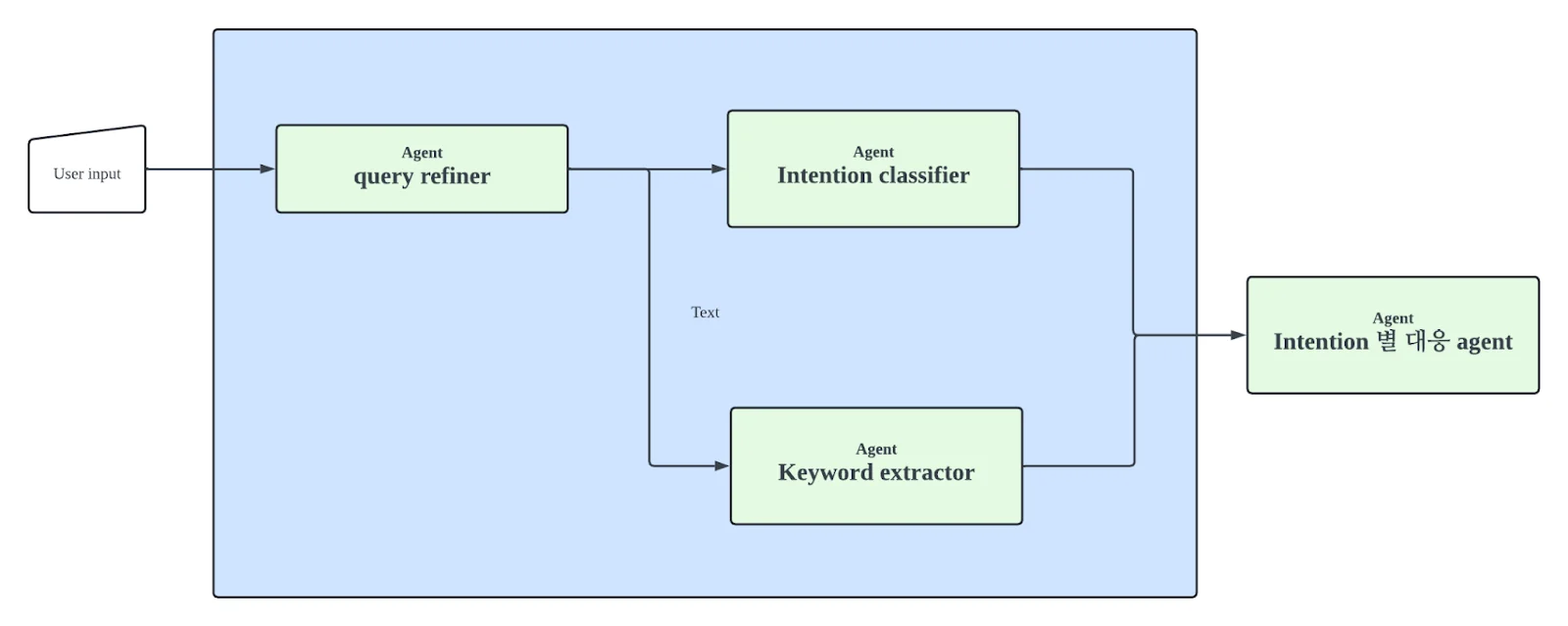 이 과정을 위해 의도 판별 에이전트를 만들었고, 그 결과에 따라 상품을 찾아볼지, 찾는다면 어떤 형태의 키워드를 필요로 하는 검색이 될지, 필요한 추가 정보를 사용자에게 물어볼지, 아니면 다른 대화 응대를 할지.. 다양한 후속 에이전트들이 의도 판별 에이전트의 결과에 따라 실행될 수 있도록 했습니다.