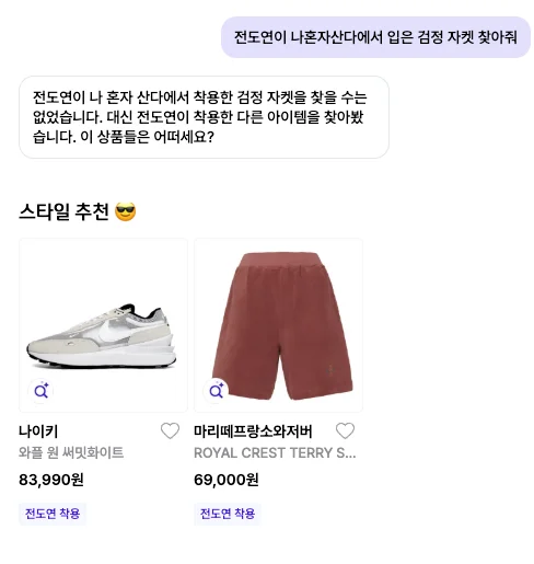 예를 들어 “신민아가 입은 재킷 중에서 연말 모임에 어울릴 만한 재킷들 추천해줘”처럼 자연스럽게 말하는 걸 그대로 이해하고 사람들이 궁금해하는 인물 중심 또는 프로그램 중심, 가격 중심, TPO 중심으로 상품을 제안해 주는 시스템은 없었습니다. 게다가 “그중 30만 원 이하인 것만 골라줘”처럼 조건을 덧붙이고, 또 “아니, 블랙 말고 화이트계열 상품도 궁금해”라는 후속 요청까지 부드럽게 이어가며 발견형 쇼핑을 이어나가기 위해서는 상당히 복잡한 언어 해석과 검색 로직이 필요했죠.
