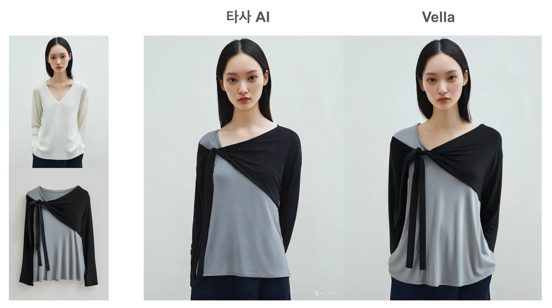 벨라는 의류의 디테일을 완벽하게 보존하는 것이 특징입니다. 형태, 색상, 기장을 정확하게 재현하며, 재질감과 패턴을 자연스럽게 표현합니다. 또한 브랜드 로고 등 섬세한 요소까지 보존할 수 있습니다. 다양한 상황에서도 안정적인 성능을 보여주는데, 다양한 체형과 포즈에서도 사실감 있는 결과물을 만들어내며, 복잡한 배경에서도 완성도 높은 착장 이미지를 생성할 수 있습니다. 실시간 처리도 지원합니다. 상의, 하의, 원피스, 아우터 등 다양한 복종을 지원하며, 모든 의류 종류에서 자연스러운 착장 이미지를 생성할 수 있습니다.